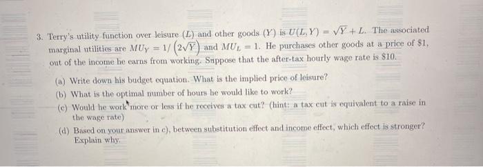 Solved 3 Terry S Utility Function Over Leisure L And O Chegg Com