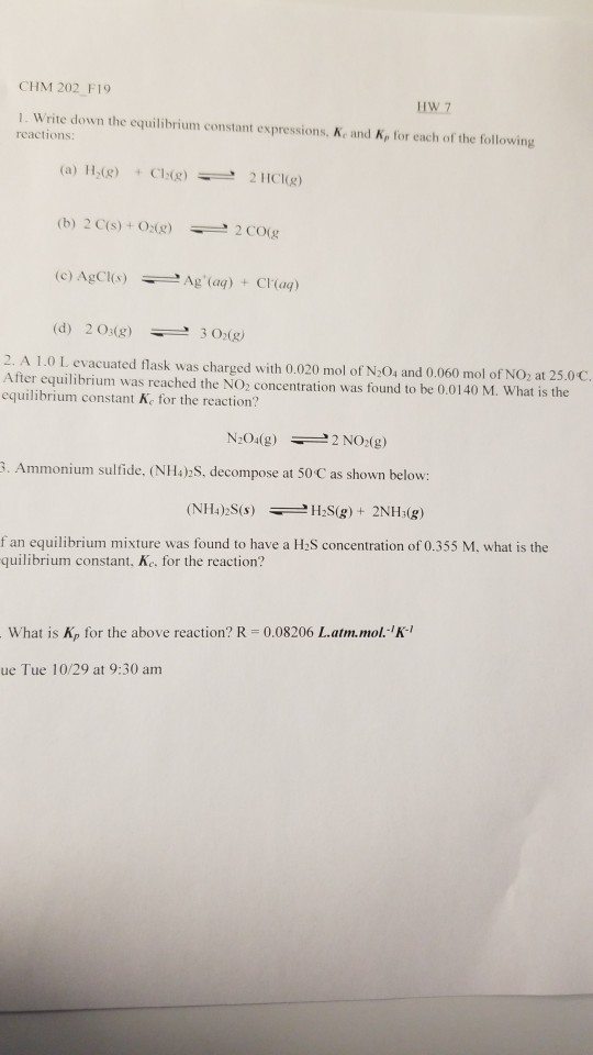 Solved Chm 2 F19 Hw 7 1 Write Down The Equilibrium Con Chegg Com