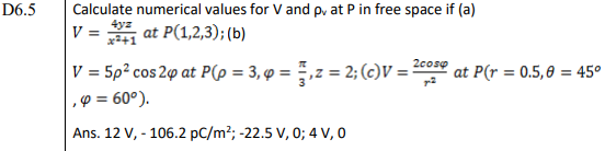Solved Calculate Numerical Values For V And At Point P In Free Space If A V 4yz X2 1 Atp 1 2 3 B V 52 Cos2 Atp 3 3 Z 2 C Course Hero