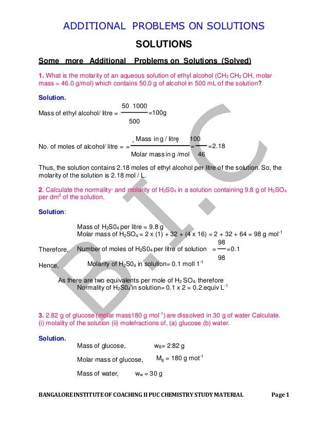 Chemistry I Honors Solution Concentration Problem Set 1 Solution