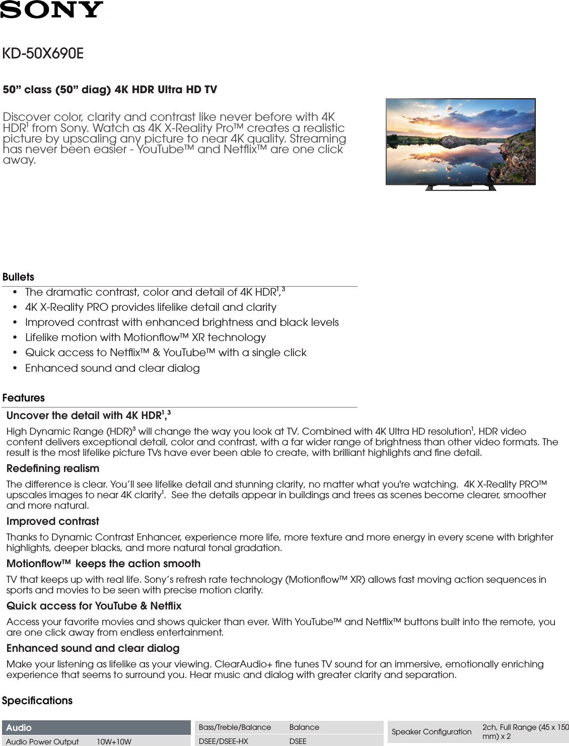 Sony Kd 50x690e User Manual Marketing Specifications Kd50x690e Mksp